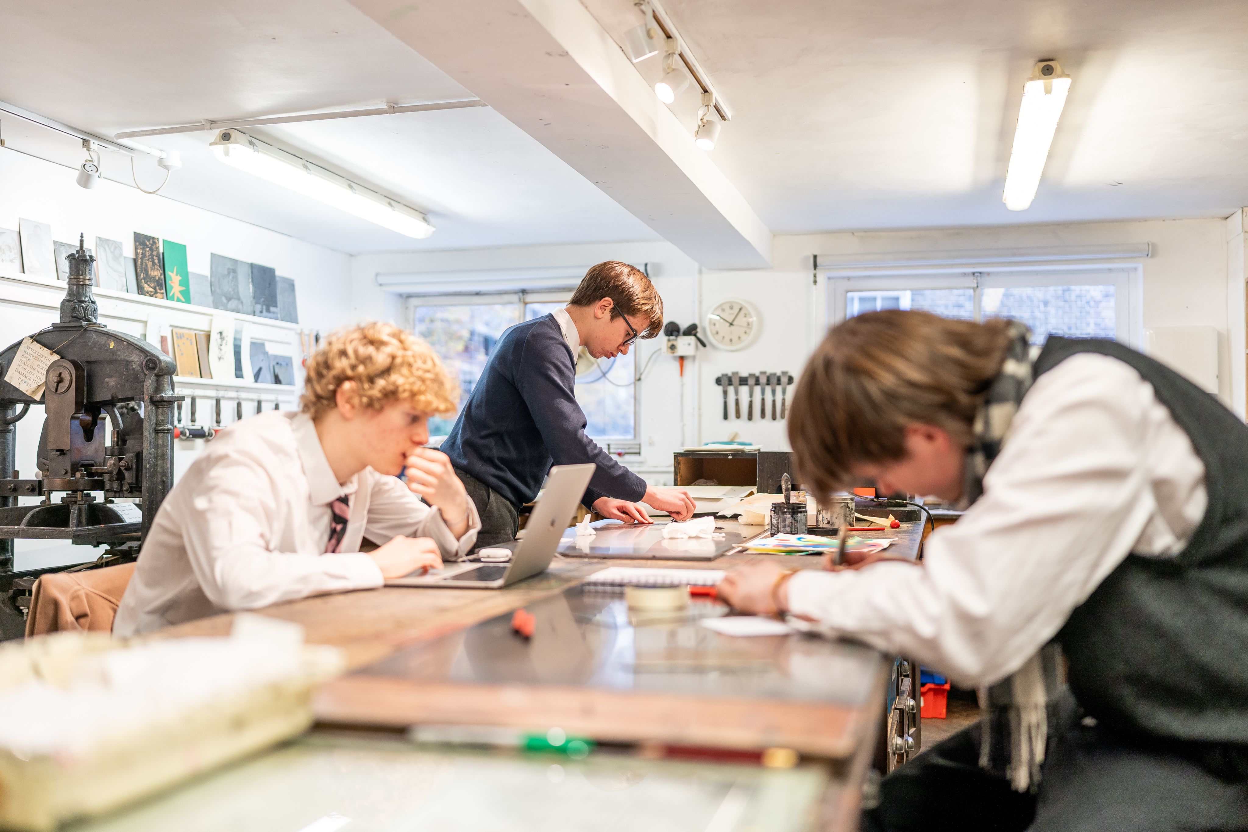 The Art Department houses a vast array of studios, many with specialist equipment, including a printmaking studio with Albion presses and a suite for etching. In addition to a digital photography space there is a large darkroom with facilities for black-and-white processing, a dedicated IT suite, film-making facilities and a well-stocked library, all set alongside architecturally fascinating and stimulating work areas.
